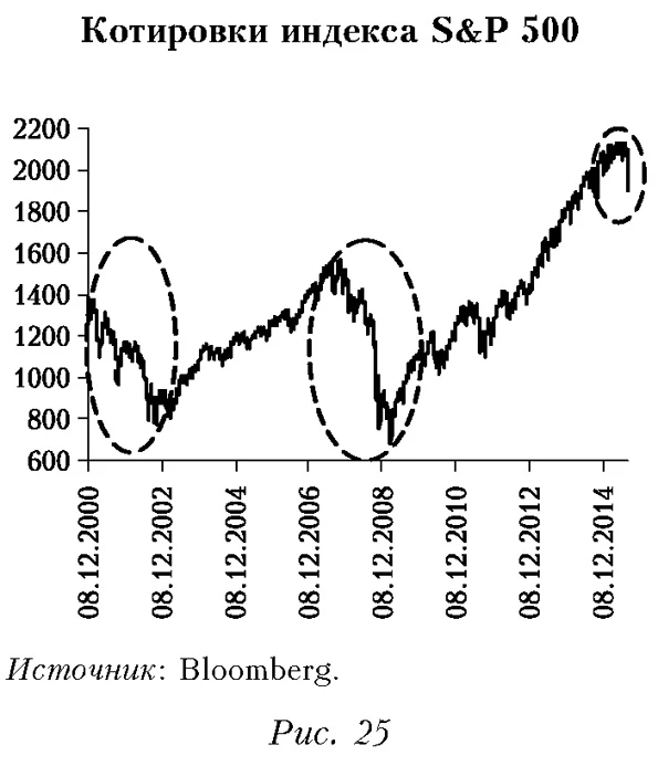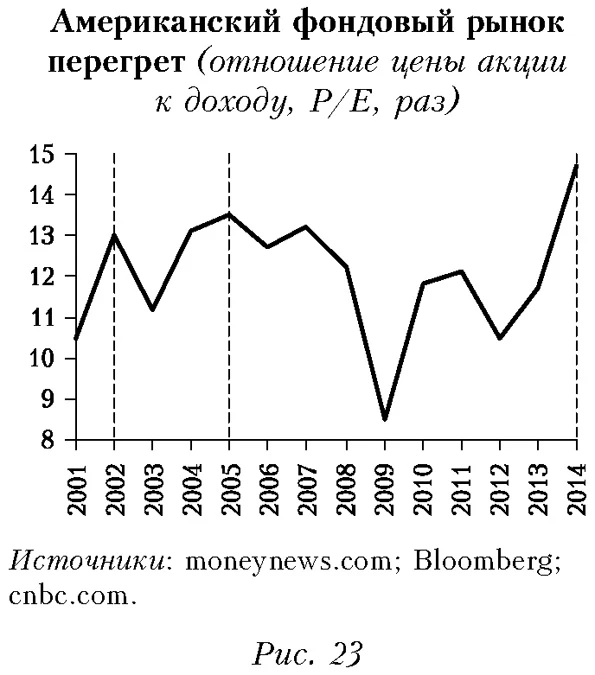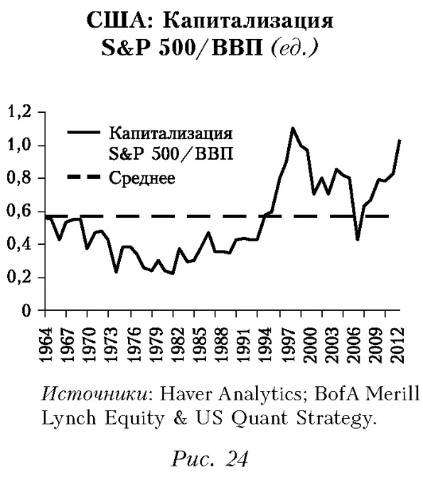 Подчеркнем, что американский фондовый рынок по ряду показателей в настоящее время находится на уровне, превышающем докризисные пики — пузыря технологических акций dotcom 2000-2001 гг. и ипотечного пузыря 2005-2007 гг. (рис. 23). Показатель уровня капитализации в целом приближается к максимальным значениям за 50 лет (рис. 24). Напомним, что после обоих пиков произошло масштабное падение котировок (рис. 25).