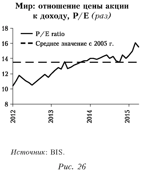 ![]() ![]() Отметим также, что показатель P/E превышает свои докризисные пики и для мира в целом (рис. 26). Следовательно, растут риски обвала (отдельные примеры, в частности, снижение китайского индекса Shanghai Composite почти на 30% за месяц, подтверждают это).