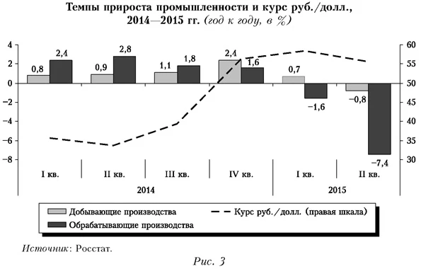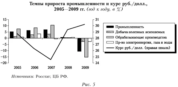 Для участников рынка укрепление национальной валюты служит серьезным стимулом для проведения операций в рублях и создает дополнительную основу для инвестиционной деятельности. Более того, с 2005 г. начались изменения в структуре роста, когда темпы прироста продукции обрабатывающих производств существенно превысили динамику добычи полезных ископаемых. Еще в 2005 г., по оценкам Всемирного банка, отмечался быстрый рост внутреннего спроса и уверенный рост в отраслях, работающих на внутренний рынок. В результате был сделан вывод, что «наблюдаемые изменения в структуре промышленного роста (особенно в обрабатывающей промышленности) свидетельствуют о значительном влиянии реального укрепления рубля» (Всемирный банк, 2005. С. 6). Указанные тенденции в целом сохранялись вплоть до кризиса 2008-2009 гг. (рис. 5). И хотя эксперты Всемирного банка задавали вопрос, насколько долговременным будет перелом тенденции в развитии обрабатывающей промышленности, тем не менее они констатировали, что ряд ее отраслей, ориентированных на внутренний спрос, «могут и далее процветать в условиях бума на внутреннем российском рынке» (Всемирный банк, 2007. С. 5).