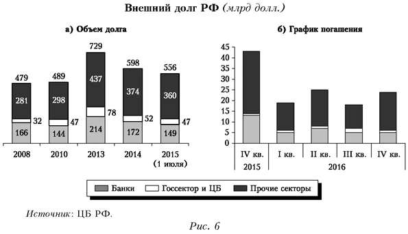 Таким образом, можно говорить о намечавшейся тогда тенденции к улучшению качества роста и постепенной (пусть медленной) переориентации «двигателей роста», во-первых, с добывающей сферы на перерабатывающие отрасли и, во-вторых, с внешнего спроса на внутренний. Уже после кризиса — в 2010 г. — был вновь сделан вывод, что двигателями экономического роста в России «являются обрабатывающие отрасли и внутренний спрос» (Всемирный банк, 2010. С. 5). Кроме того, согласно оценкам МВФ, стремительное обесценение валют на развивающихся рынках обострило для их компаний проблемы заимствований в иностранной валюте и вызвало значительный отток капитала (IMF, 2015a. P. ix). Указанная проблема крайне актуальна для России, учитывая высокий уровень корпоративного внешнего долга и объем ожидаемых платежей по нему (рис. 6).