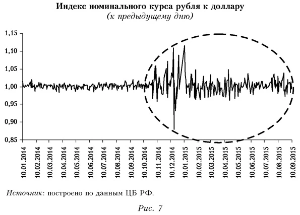 О новой редакции денежно-кредитной политики Банка РоссииВызывает сомнение эффективность достижения целей, обозначенных в новой редакции денежно-кредитной политики (ДКП) Банка России. В частности, одна из них звучит так: «Защита и обеспечение устойчивости рубля является основной функцией Банка России в соответствии с Конституцией Российской Федерации» (Банк России, 2015. С. 3). При этом введение режима свободного плавания резко увеличило волатильность рубля (рис. 7), создав большую неопределенность для субъектов экономики.
