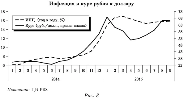 Кроме того, согласно Банку России, «устойчивость рубля обеспечивается посредством поддержания ценовой стабильности (курсив мой. — М. Е.), что является основной целью денежно-кредитной политики» (Банк России, 2015. С. 3). Только с ноября 2014 по январь 2015 г. инфляция выросла практически в два раза (с 8 до 15%). Указанный рост был вызван резким удешевлением рубля — с 45 до почти 70 руб./долл. При этом, даже по оценкам Э. Набиуллиной, превышение инфляцией целевого уровня 5% примерно «на две трети обусловлено ослаблением курса»3. Другими словами, Банку России пока не удалось достигнуть ни первой цели — сохранить устойчивость рубля, ни второй — обеспечить ценовую стабильность.В целом отметим сильную корреляцию между движением цен и валютным курсом (рис. 8). Также обратим внимание, что когда курс рубля начал меняться в обратную сторону, то есть укрепляться, цены снизились незначительно. Это лишний раз подчеркивает хорошо известную особенность поведения цен: они намного легче повышаются, чем снижаются.