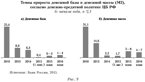 Для стабилизации валютного рынка регулятор ограничил предоставление рублевой ликвидности, что, естественно, приведет к снижению темпов экономического роста. Другой причиной снижения будет медленный рост денежной базы и денежной массы, что прогнозируется в Основных направлениях денежно-кредитной политики ЦБ РФ на текущий период и на перспективу (рис. 9).
