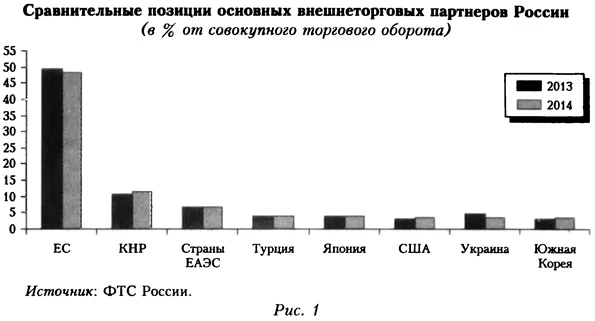 ЕС по-прежнему остается ключевым партнером России, на который пришлась почти половина (48,2%) ее внешнеторгового оборота (52% совокупного российского экспорта и 41,4% российского импорта). Для сравнения: интенсивность торговли с Китаем (вторым по значимости торговым партнером России) уступала показателям ЕС более чем в 4 раза. На него в прошлом году пришлось 11,3% внешнеторгового оборота России, а на страны Евразийского экономического союза — ЕАЭС (Белоруссия, Казахстан, Армения) — лишь 6,9%. Даже Украина, несмотря на значительное (более чем на 1 п. п.) падение доли в российской торговле, уверенно входит в число восьми ведущих торговых партнеров России. При всей драматичности происходящих изменений они носят скорее количественный, а не качественный характер. Таблица 1 Страновая структура внешней торговли России