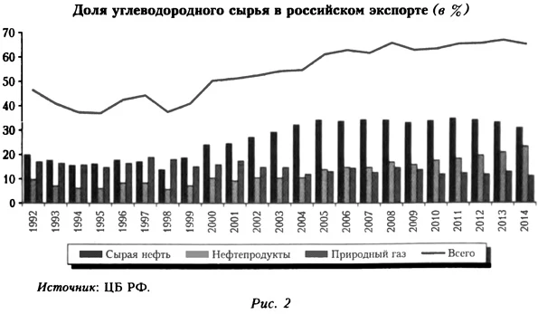 Источник: ФТС России. Столь выраженная устойчивость страновой структуры внешней торговли России кажется парадоксальной только на первый взгляд, но имеет прочные объективные основания. С одной стороны, страновая структура российского экспорта в решающей мере определяется направлениями поставок углеводородного сырья. Несмотря на многолетние дискуссии о необходимости диверсификации экспорта и ухода от сырьевой специализации страны, доля энергоносителей в структуре российского экспорта устойчиво повышалась, и в последние годы они обеспечивают более 65% экспортных поступлений (рис. 2). Сохраняющаяся ориентация на преимущественно трубопроводные каналы поставки означает высокую инерцию в географии экспорта и делает невозможным быстрый маневр торговыми потоками в ответ на изменение политических условий сотрудничества с ключевыми партнерами.