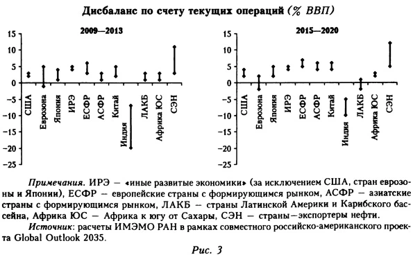 Обобщающая информация по ожидаемой динамике дисбалансов приведена на рисунке 3. Возможность для России компенсировать потерю доступа к финансовым рынкам развитых стран прослеживается только на рынках Китая и других развивающихся экономик Азии, где профицит платежного баланса по счету текущих операций в 2015-2020 гг. будет составлять порядка 5% ВВП, и ведущих стран — экспортеров нефти, где соответствующий показатель окажется в диапазоне 5-12% ВВП. На первом направлении успехи российских компаний пока довольно скромные: по сравнению с утраченными возможностями на западном направлении, доступ на азиатские финансовые рынки оказался существенно более сложным, а стоимость кредитных ресурсов — существенно более высокой. Финансовые рынки ведущих стран — экспортеров нефти (в первую очередь так называемых «Монархий Залива») российскими компаниями практически не освоены. Оба географических направления нельзя назвать легкими с точки зрения грядущего «похода за капиталом», но в случае сохранения санкционного режима других вариантов для российских компаний, похоже, не предвидится.