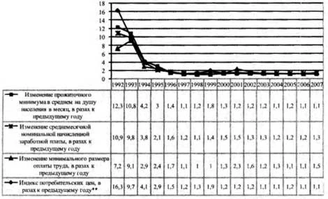 Примечание: с 1992 по 2004 г. парный коэффициент корреляции рассчитан для значений уровня рентабельности и размера денежной заработной платы с использованием отраслевой классификации, в 2005-2006 гг. - в разрезе видов экономической деятельности (28 позиций). Таким образом, изучение взаимосвязи между уровнем рентабельности и размером заработной платы позволяет сделать вывод о том, что рентабельность все в большей степени превращается в важный фактор увеличения размера заработной платы. Однако вряд ли можно утверждать, что это влияние в настоящее время является устойчивым, так как взаимосвязь проявляется лишь в общем, на межотраслевом уровне. Что касается института социальных гарантий, то именно он, с нашей точки зрения, в условиях трансформирующейся экономики является определяющим фактором размера и динамики индивидуальной оплаты труда. Это такой формальный институт российского общества, который в системе различных факторов, влияющих на уровень оплаты труда, играет роль первого толчка, непосредственно приводящего к изменениям в системе первичного распределения доходов. Есть своеобразный автоматизм в изменении размера заработной платы всех категорий работников в зависимости от величины прожиточного минимума, минимального размера оплаты труда, и не только потому, что гарантии взаимосвязаны в определенной степени с величиной низшей тарифной ставки или должностным окладом, но и в силу специфики неформальных институтов, инерции и традиций. Конечно, вполне оправданы опасения, связанные с усилением инфляционных процессов по мере роста денежных доходов населения. Однако гарантией недопущения развития ситуации в негативном русле может быть комплексность принимаемых мер, их научная обоснованность и последовательность в реализации принимаемых решений. 1 Труд и занятость в России: Стат. сб. // Госкомстат. - М., 2001. С. 356, 365. 2 Труд и занятость в России. 2007: Стат. сб. // Росстат. - М., 2007. С. 387, 392. 3 U. S. Department of Labor // National Compensation Survey: Occupational Wages in the United States, June 2006. 4 U. S. Census Bureau. Housing and Household Economic Statistics Division. 5 Бобков В. О задачах повышения уровня и качества жизни населения России // Общество и экономика. 2000. № 2. С. 38-40. 6 Использовался массив статистических данных за 1992-2004 гг., так как Росстат начиная с 2005 г. публикует соответствуюигую информацию в разрезе видов экономической деятельности. 7 По данным Росстата, уровень рентабельности в экономике России в целом за период реформ снизился с 29,3% в 1992 г. до 4,8% в 1996 г., в последующие годы он начал расти, хотя и не вполне последовательно. В 2006 г. уровень рентабельности проданных товаров, работ и услуг составлял 13,2%.