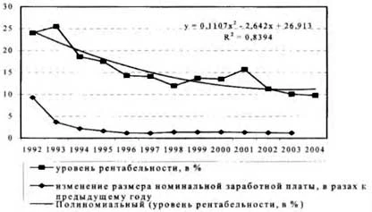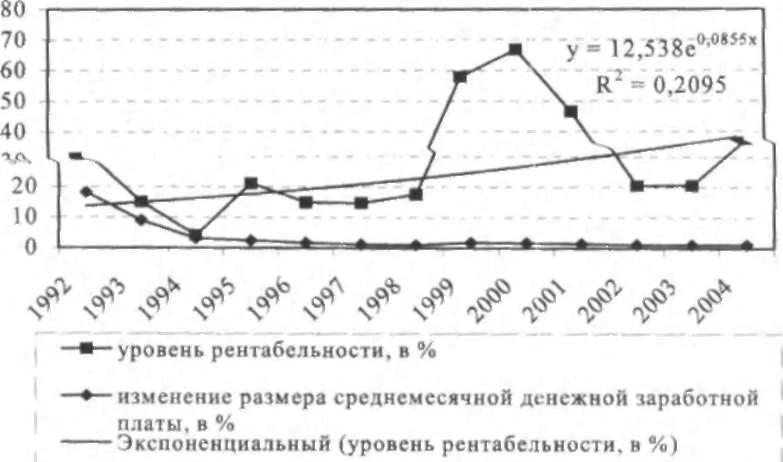 Источник: Российский статистический ежегодник. 2001. С. 551; 2005. С. 190, 377-422; 2007. С. 184, 679-680. * Значение t-статистика указано для тех позиций, где коэффициент корреляции является значимым. ** Коэффициент корреляции рассчитывался для периода 1992-2006 гг., в разрезе отраслей - за период 1992-2004 гг. Поскольку в данном случае анализируется динамический ряд данных, зависимость между параметрами обратная, что объясняется наличием разных трендов: снижением уровня рентабельности в годы реформирования и быстрым ростом, особенно в отдельные годы, номинальной заработной платы 1. Коэффициент корреляции между уровнем рентабельности и темпами роста (снижения) размера номинальной заработной платы в целом в экономике высокий и имеет положительный знак. Но каков экономический смысл этих взаимосвязей? Является ли изменение уровня рентабельности причиной изменений в приростных значениях абсолютных размеров заработной платы? Отвечая на этот вопрос, мы проанализировали соответствующее соотношение в отраслевом разрезе. По отраслям картина выглядит пестрой, хотя преобладает обратный характер зависимости между рентабельностью и абсолютной величиной заработной платы, и положительная связь - между уровнем рентабельности и изменением размера заработной платы. В большинстве отраслей взаимозависимость уровня рентабельности и размера заработной платы характеризуется низким коэффициентом корреляции, но исключение представляют электроэнергетика, машиностроение, пищевая промышленность и строительство. Высокая корреляционная зависимость между уровнем рентабельности и изменением размера среднемесячной денежной заработной платы присуща почти всем отраслям, но выделяются две отрасли, в которых она практически отсутствует, - нефтедобывающая промышленность и транспорт, в «связи» же она достаточно высока, причем носит обратный характер. Изменения размера денежной заработной платы одинаковы во всех отраслях, отсюда следует вывод - высокий коэффициент корреляции получен в силу общей тенденции снижения темпов роста заработной платы. В тех отраслях, где эта тенденция совпадала с характером изменений уровня рентабельности, а именно снижением, получена высокая корреляционная зависимость этих двух параметров. И таких отраслей большинство, поскольку преобладала в этот период тенденция снижения уровня рентабельности. В качестве примера показаны кривые уровня рентабельности и динамики темпов роста заработной платы в электроэнергетической отрасли, имеющей один из самых высоких коэффициентов корреляции между анализируемыми параметрами (рис. 2).
